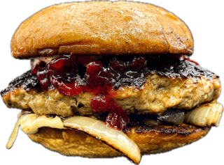 Brioche bun - 280gr phat burger - pepersaus - cranberry saus - gekarameliseerde ui